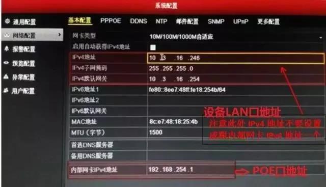 注意:不能将PoE录像机LAN口IP地址设置成和内部网卡IP地址在一个网段,否则通道将无法添加。