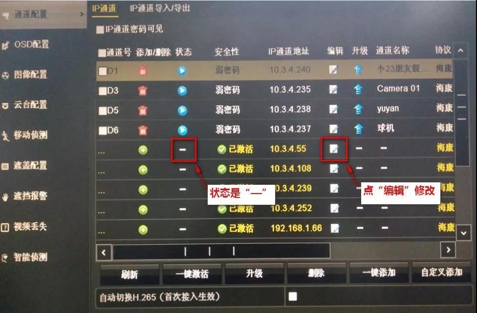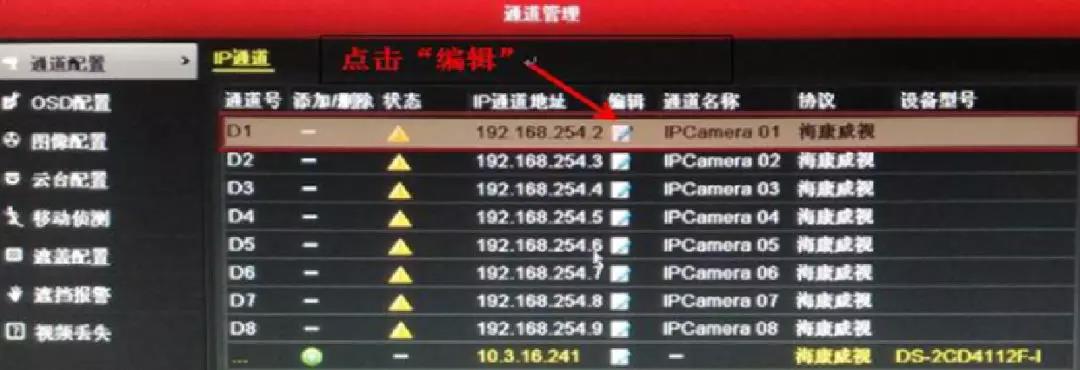 ③ 选择IP通道状态为“三角感叹号”(点击提示网络不可达),且无法删除的通道,点击“编辑”,进入通道编辑界面。