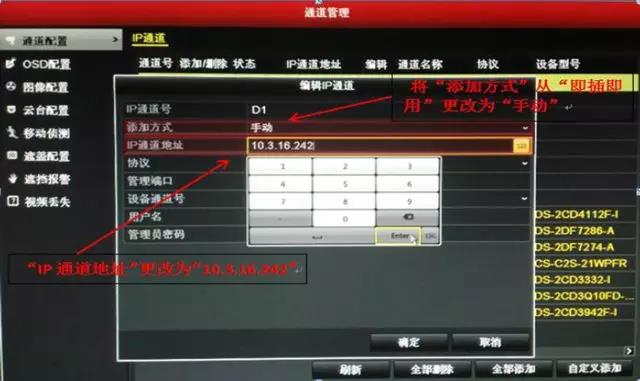 ④ 将“添加方式”改为“手动”,将“IP通道地址”改为②中你修改成功的摄像机IP地址,密码为摄像机激活密码,点击“确定”。